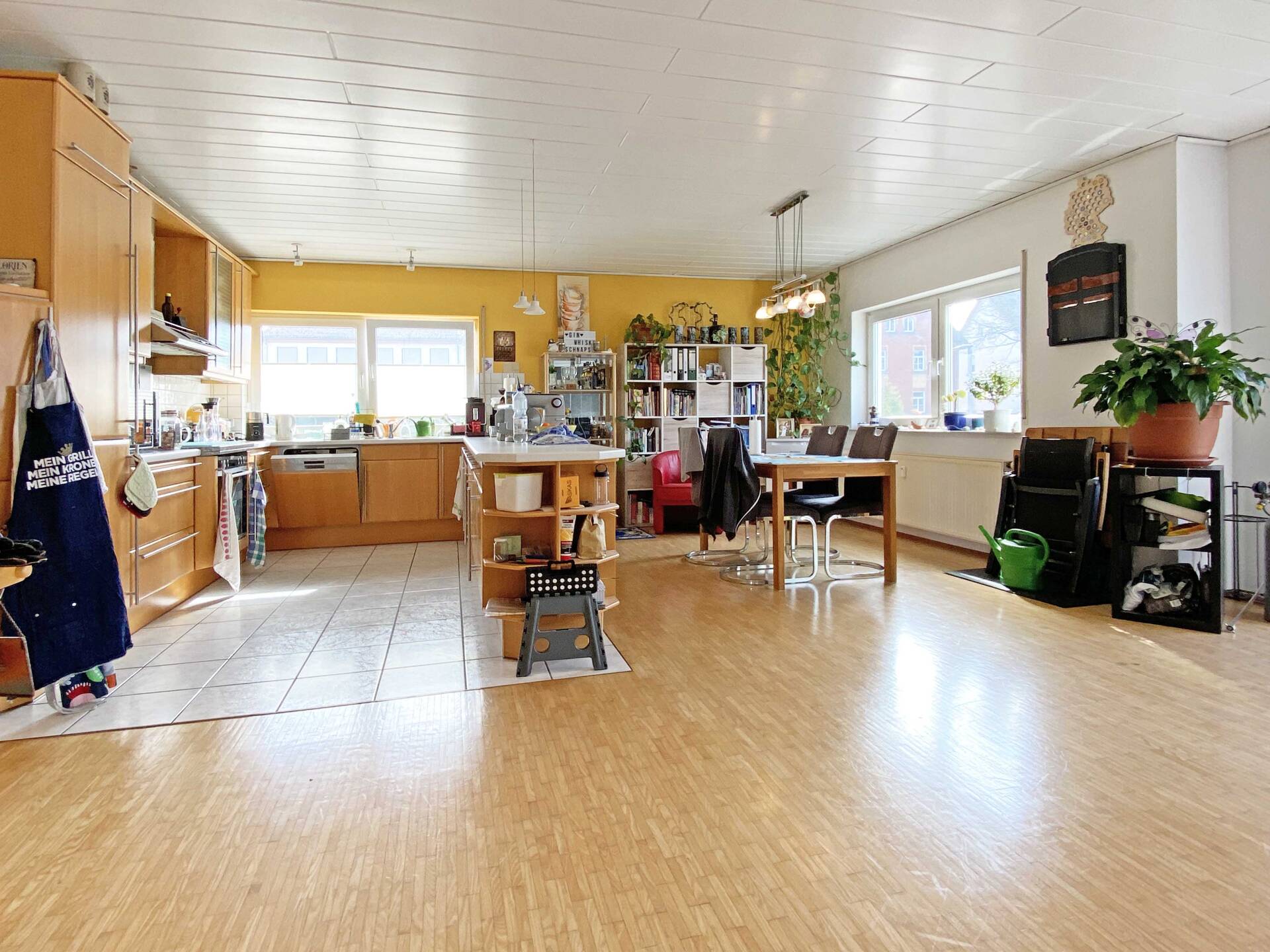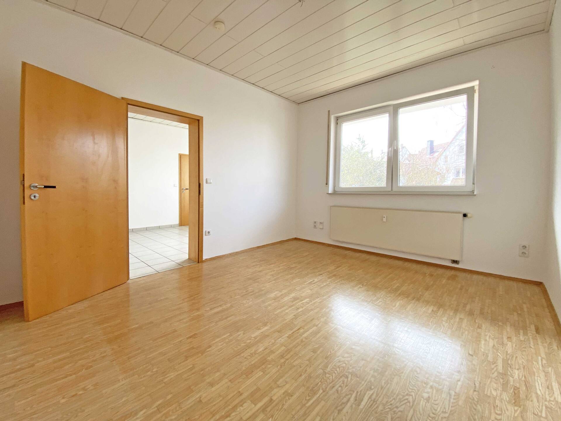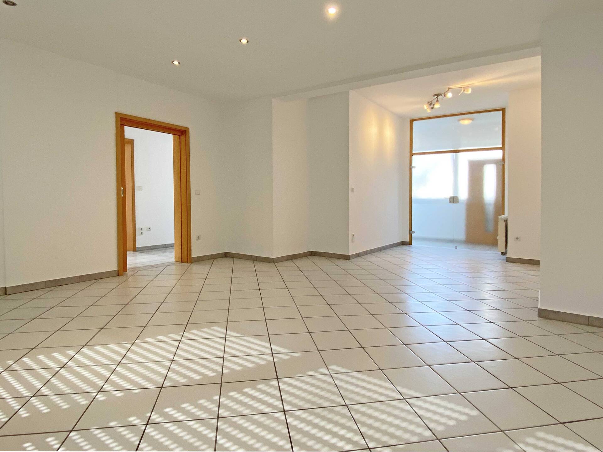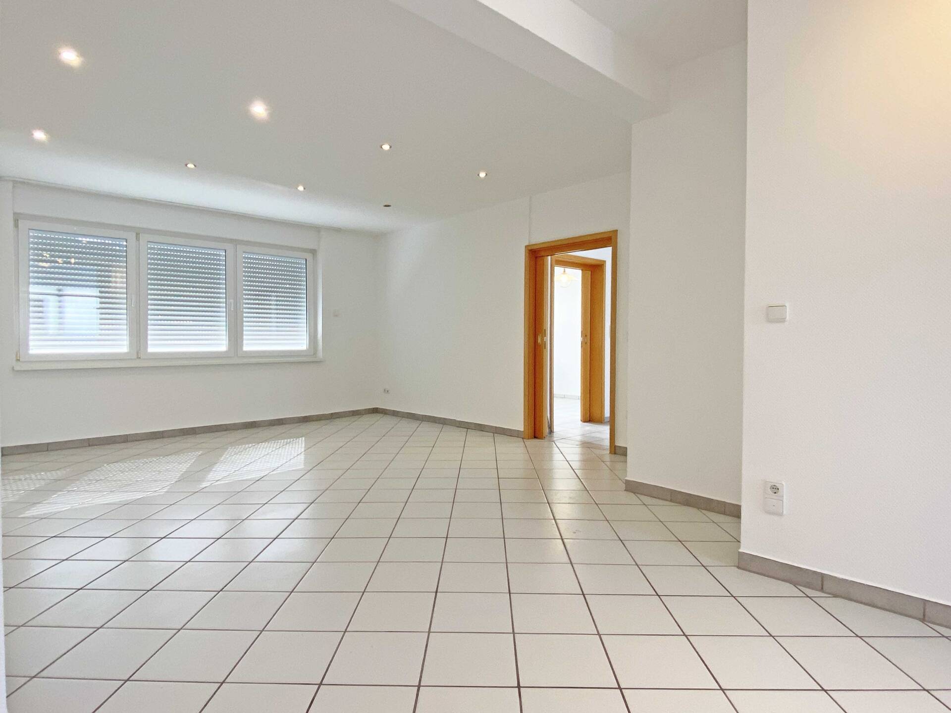 Die Erdgeschosswohnung bietet ein großzügiges Wohnzimmer mit angrenzendem Essbereich, wodurch eine angenehme Verbindung zwischen Wohnen und Essen entsteht. Die separate Küche ist funktional geschnitten und mit einer Einbauküche ausgestattet. Zwei weitere Zimmer stehen flexibel als Schlaf-, Kinder- oder Arbeitszimmer zur Verfügung. Das moderne Tageslichtbad bietet eine geräumige Dusche.
