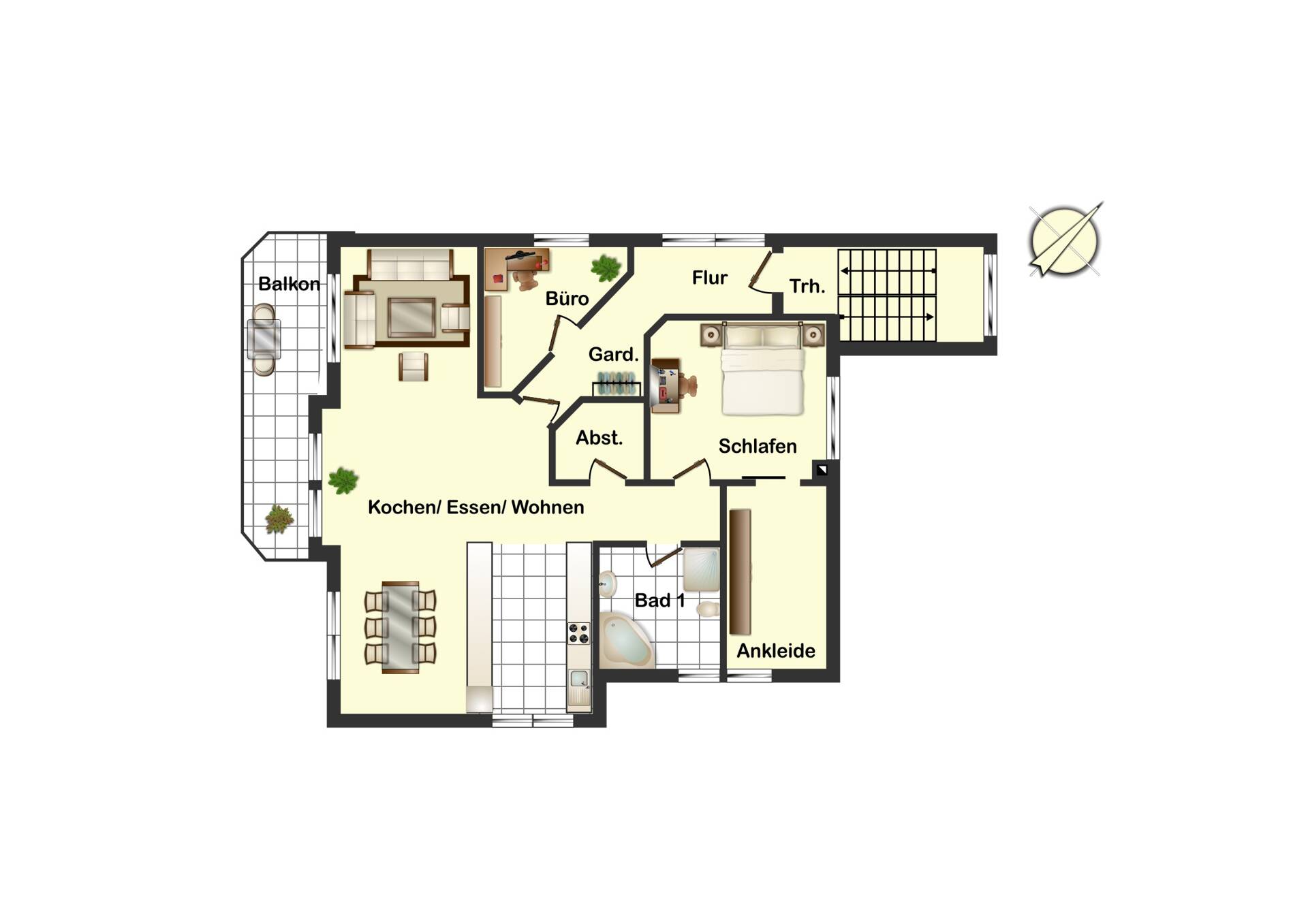 Die Obergeschosswohnung überzeugt durch einen offen gestalteten Wohn-, Koch- und Essbereich, der den zentralen Lebensmittelpunkt der Einheit bildet. Von hier aus besteht Zugang zum Balkon, der zusätzlichen Freiraum im Außenbereich schafft. Das Schlafzimmer wird durch eine separate Ankleide ergänzt. Zwei Badezimmer bieten zusätzlichen Komfort. Abstellflächen sowie ein Garderobenbereich im Eingangsbereich runden das Raumangebot ab.