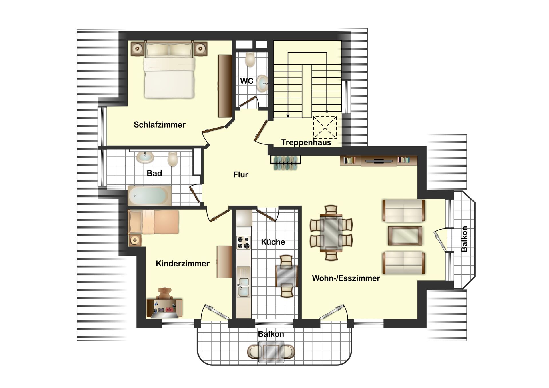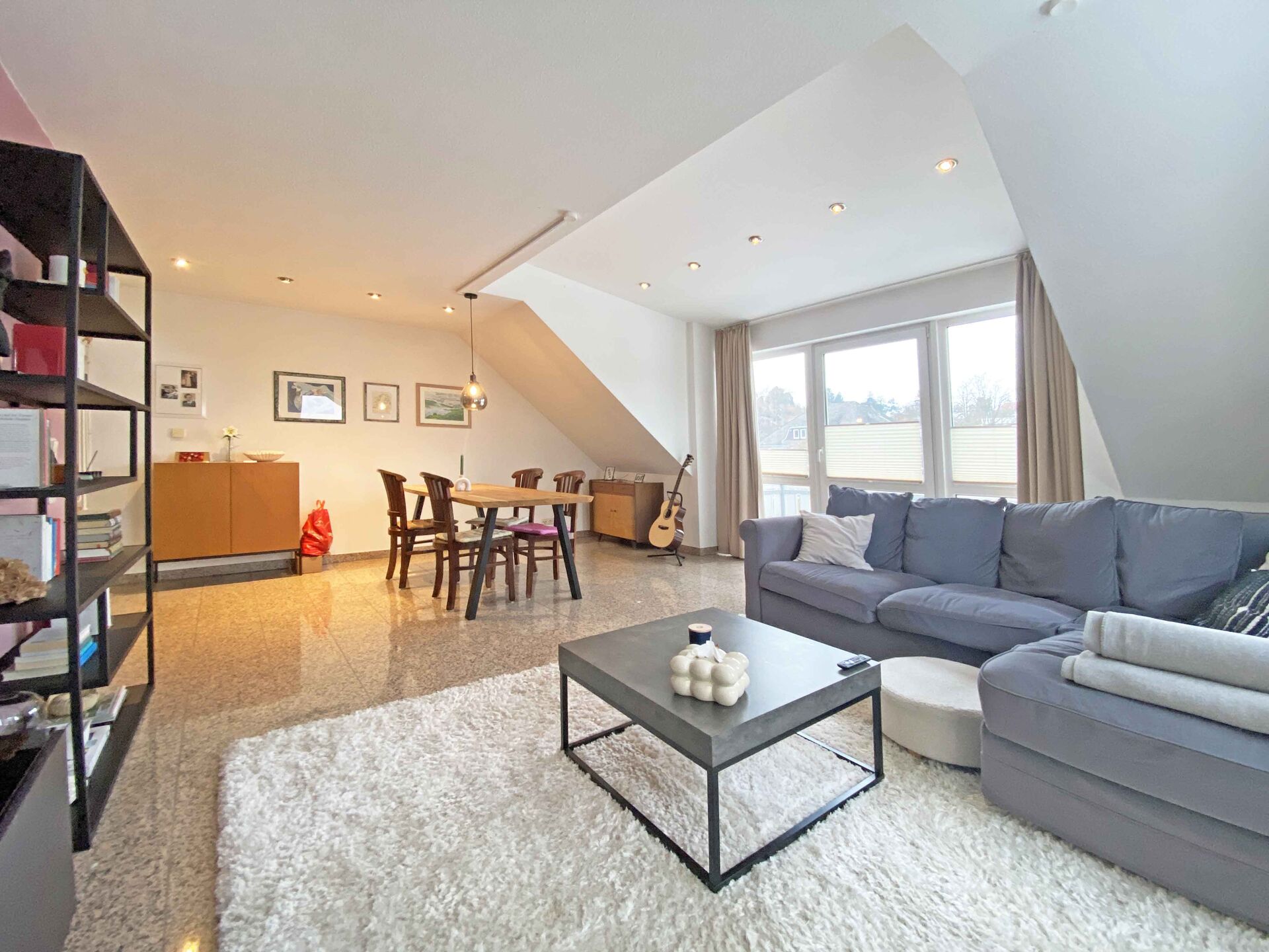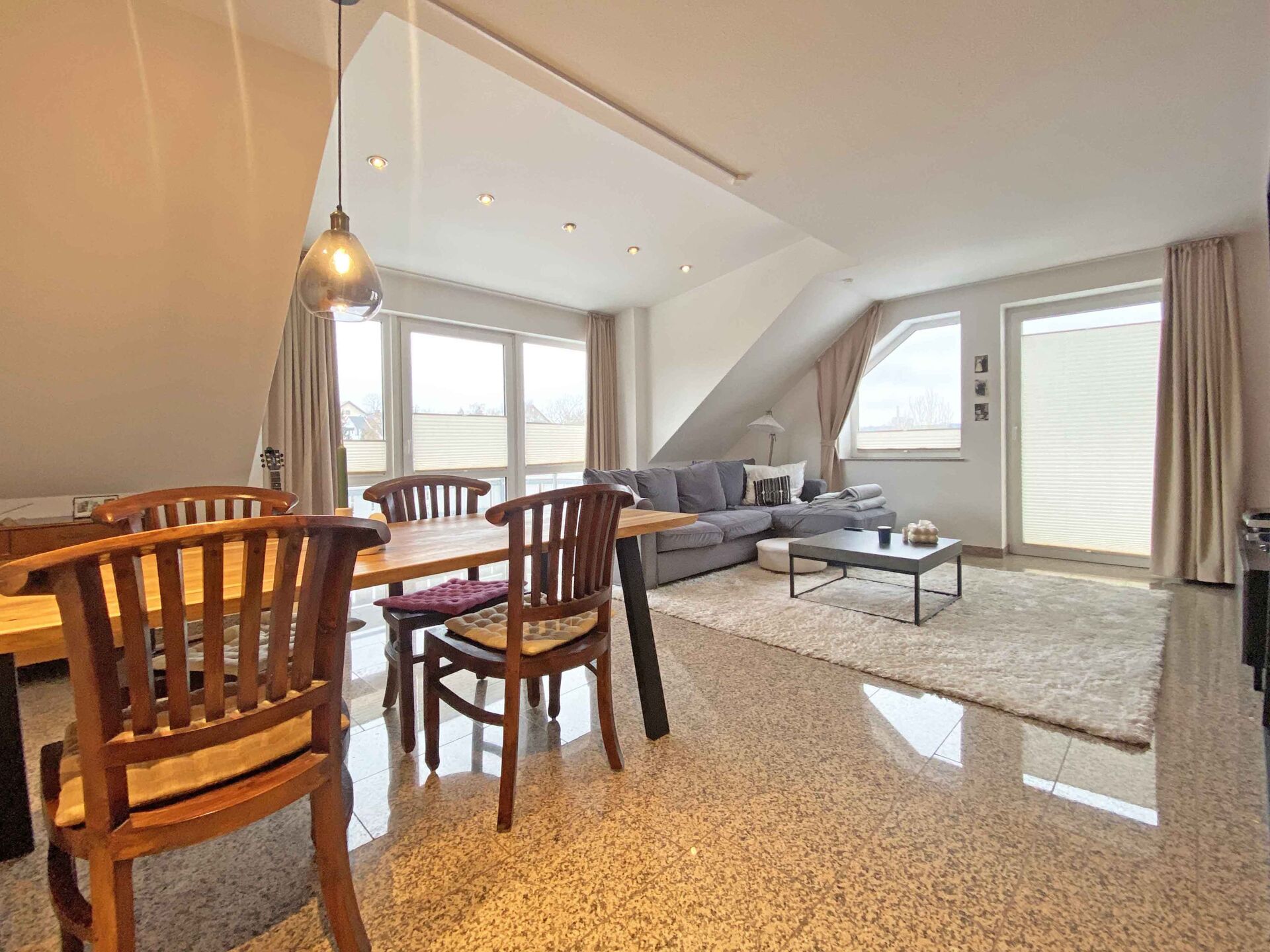 Im Mittelpunkt steht der weitläufige Wohn- und Essbereich mit offener Gestaltung. Großzügige Fensterflächen sorgen für eine angenehme Belichtung und unterstützen das klare Raumgefühl. Zwei Balkone erweitern den Wohnraum und schaffen zusätzliche, gut nutzbare Außenbereiche mit Blick in das umliegende Umfeld.