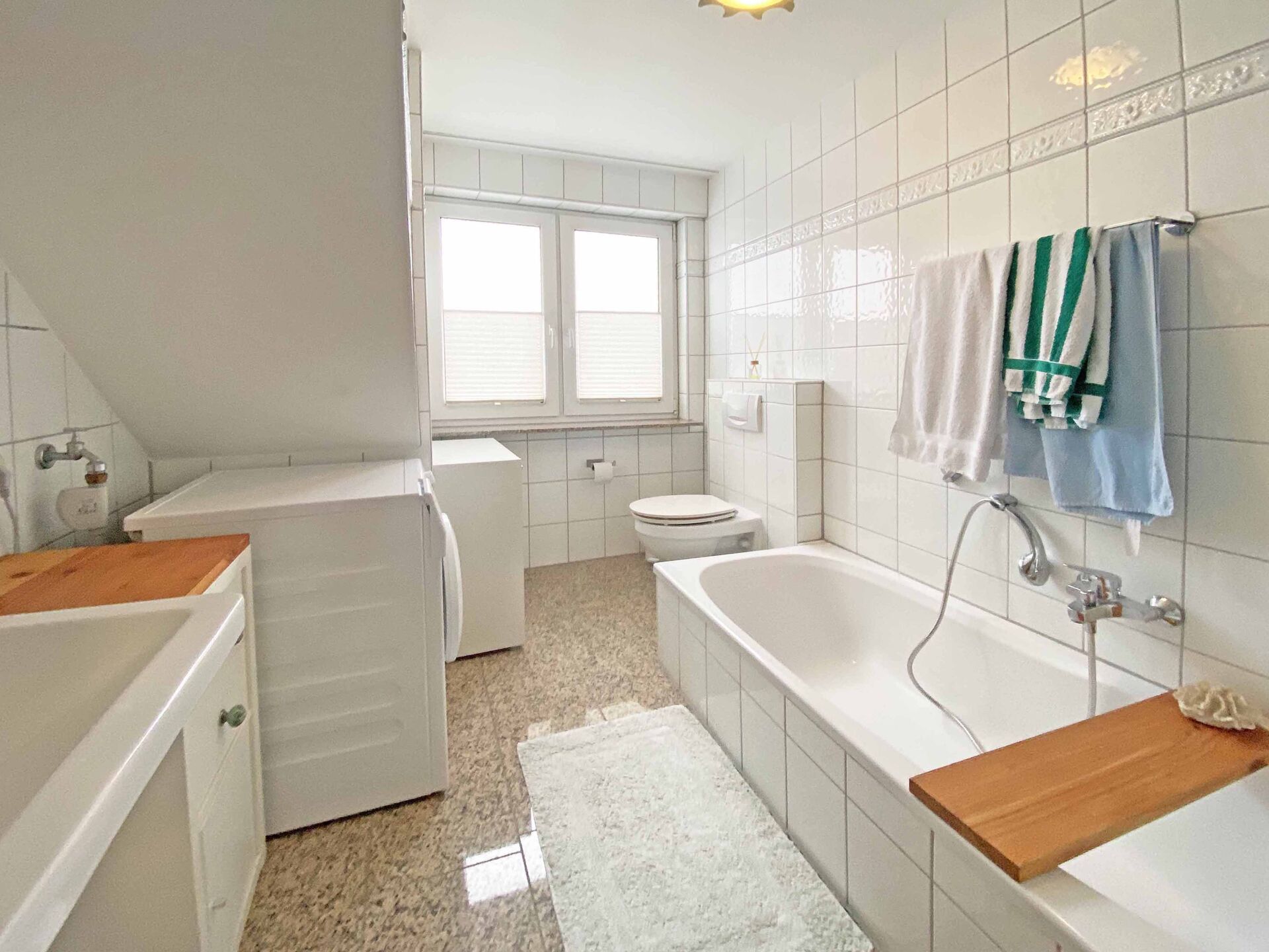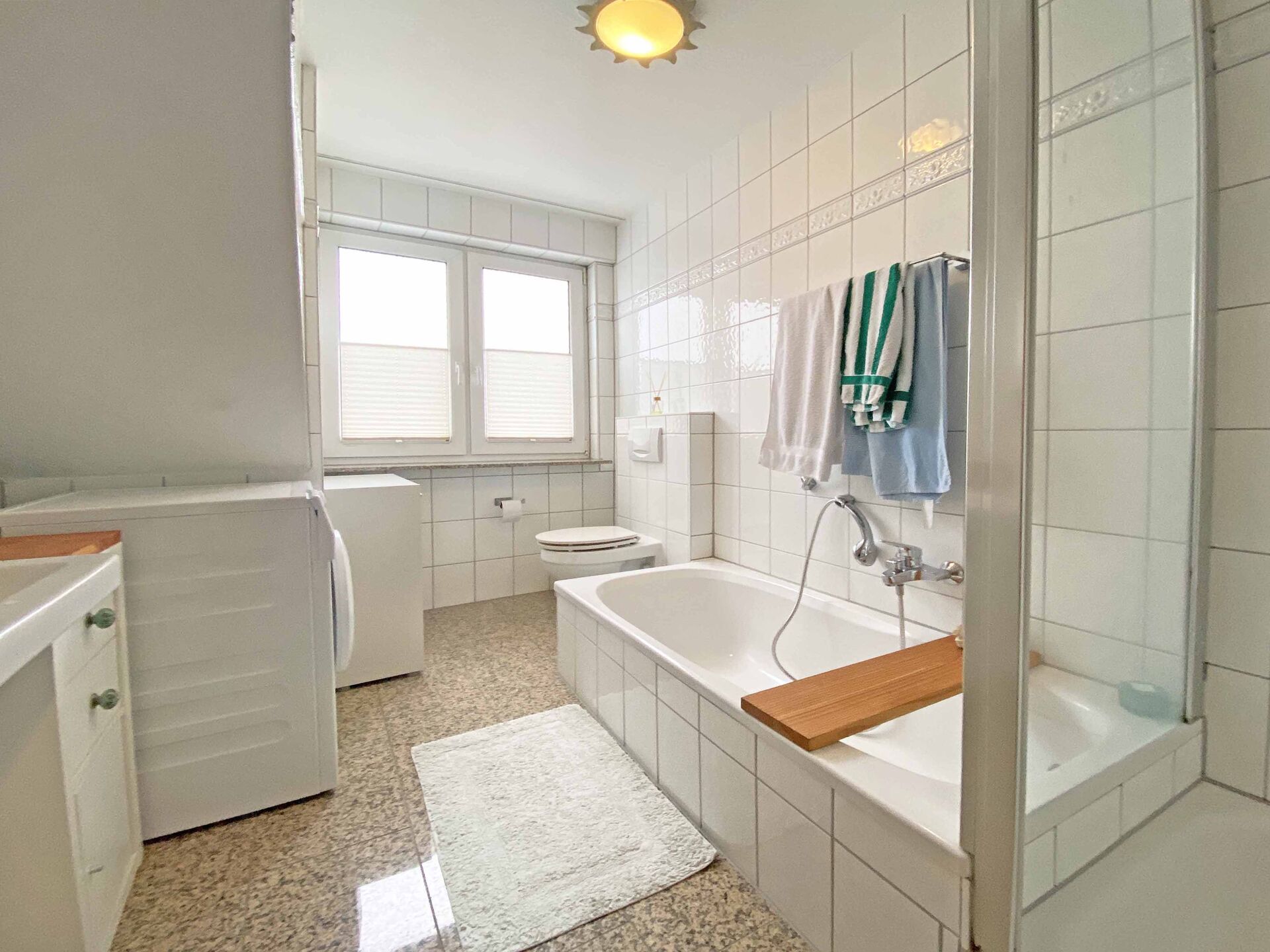 In der Wohnung sind die Fußböden überwiegend mit hochwertigen, pflegeleichten Fliesen ausgeführt. Die Wandflächen sind hell gehalten und unterstützen die Lichtwirkung der großzügigen Fensterflächen. Das Tageslichtbad ist hell gefliest und mit Badewanne, Dusche, Waschbecken und WC ausgestattet; ein separates Gäste-WC ergänzt die sanitäre Ausstattung.