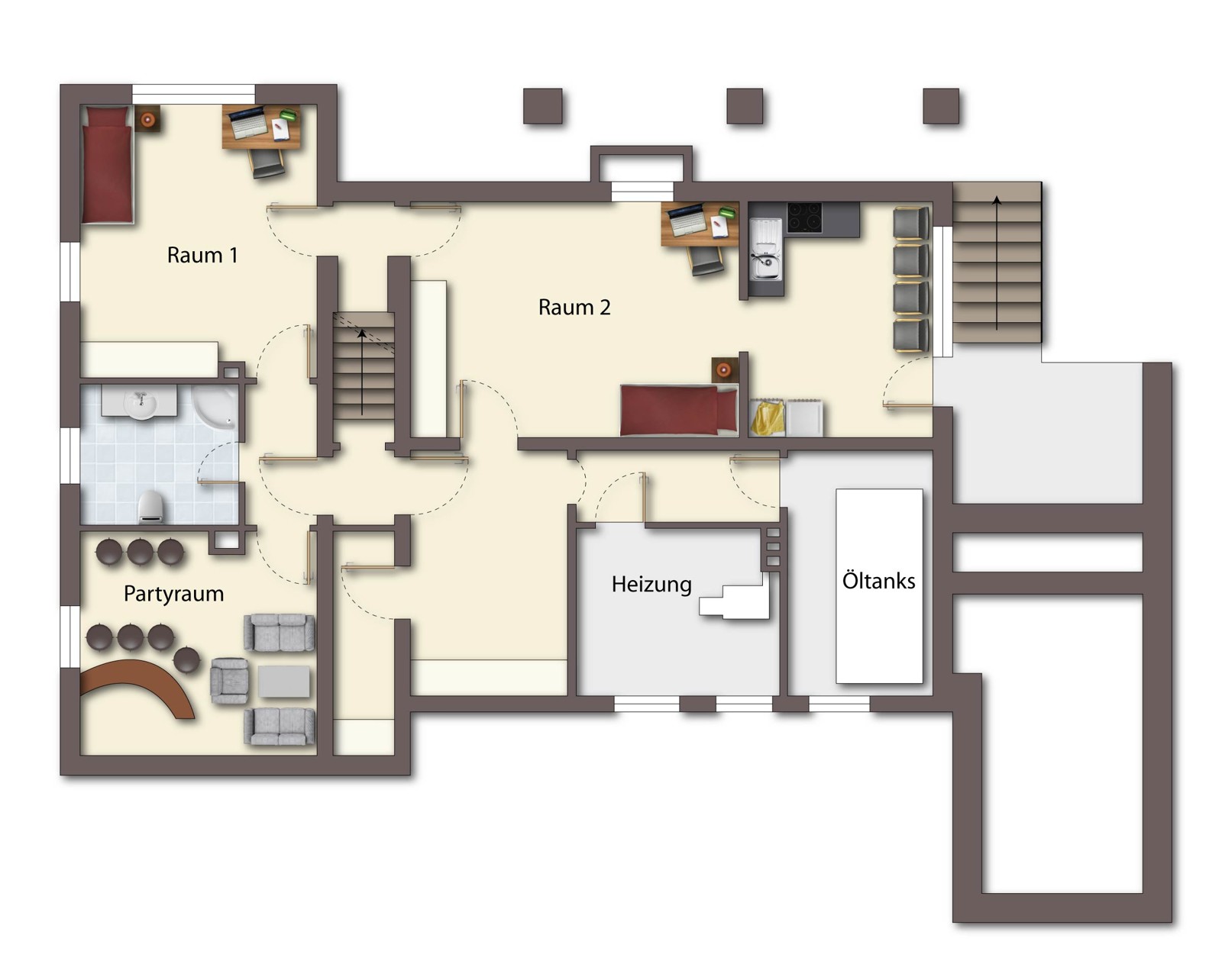 Die Fenster sind überwiegend als isolierverglaste Holzfenster ausgeführt und tragen zu einem angenehmen Wohnklima bei. Die Böden sind mit Parkett, Teppichboden und Fliesen ausgelegt.